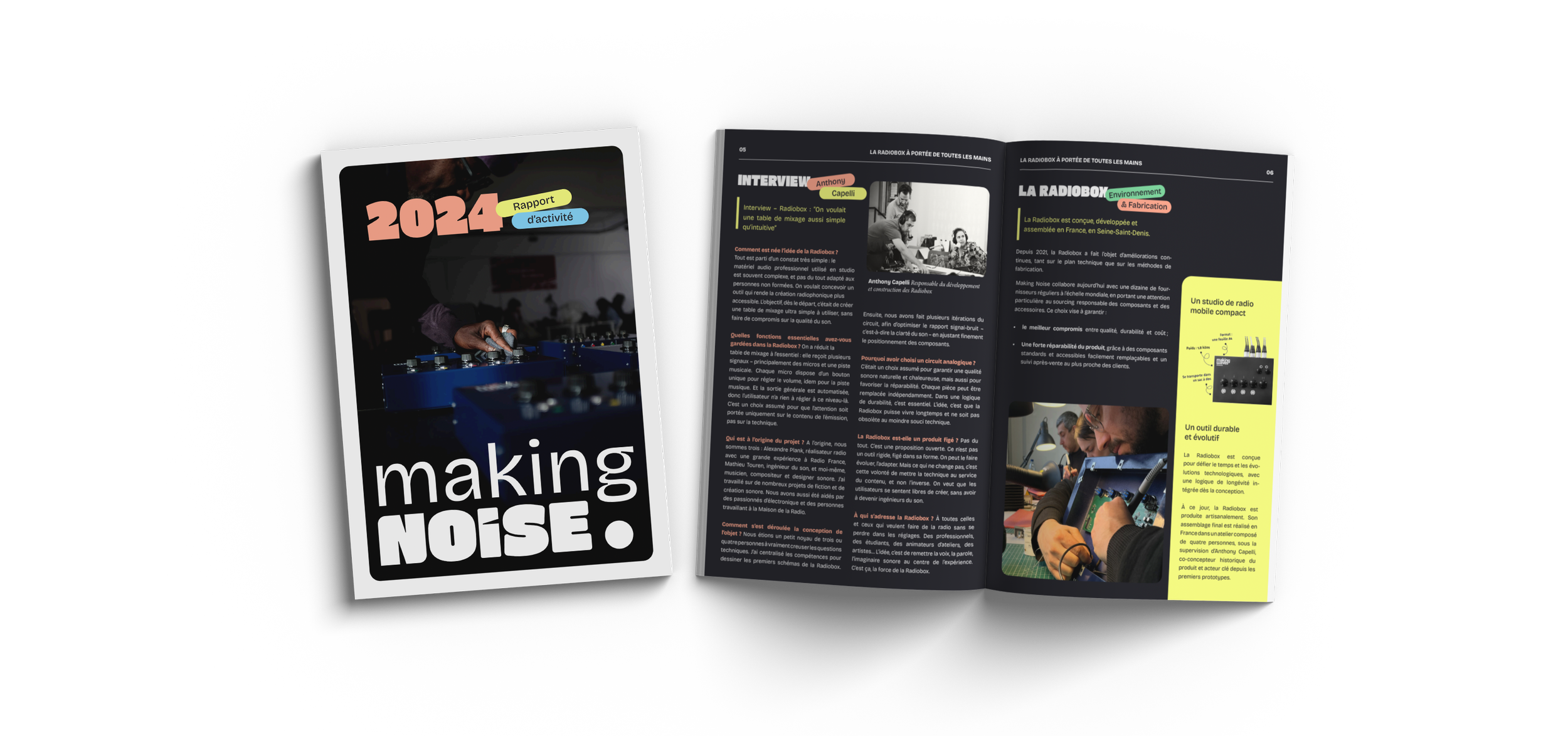 Making Noise är ett dotterbolag till Making Waves och en integrerad del av deras verksamhet. Centralt för Making Noise är Radioboxen, ett batteridrivet, bärbart och mycket enkelt radio-/pod-studio-kit som utvecklats och byggs i Noisy-le-Sec, Frankrike.